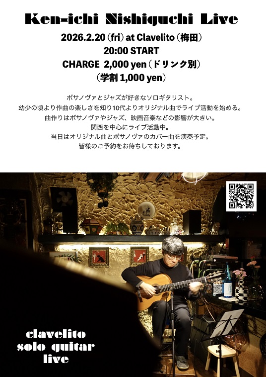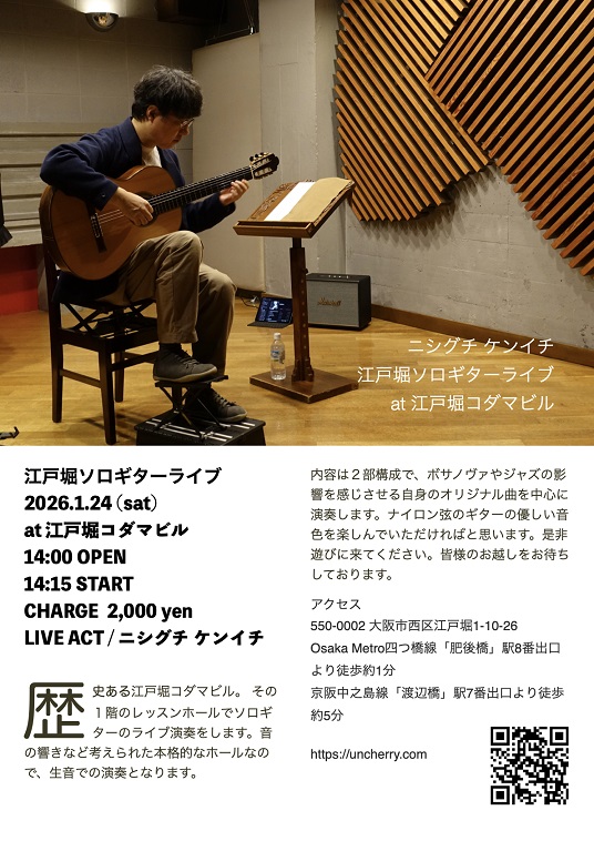 ギタリスト・ニシグチ ケンイチ(Ken-ichi Nishiguchi)のウェブサイト。ライブ活動を中心に、大阪・玉造でボサノヴァ専門のギター教室「uncherry bossa nova guitar school」 (アンチェリー・ボサノバギタースクール)を主宰しています。