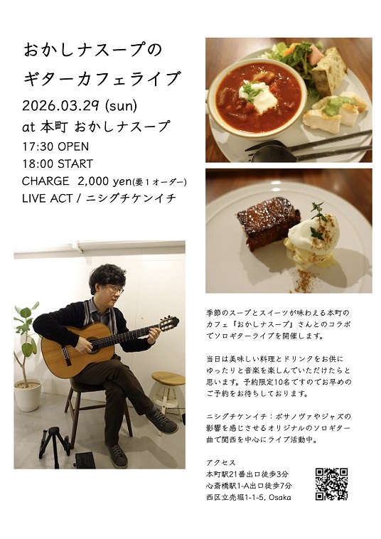 季節のスープとスイーツが美味しい本町の「おかしナスープ」でライブをします。今回はゲストなしの初のソロライブ!詳細はこちら→「おかしナギターライブ vol.3」をご覧ください。