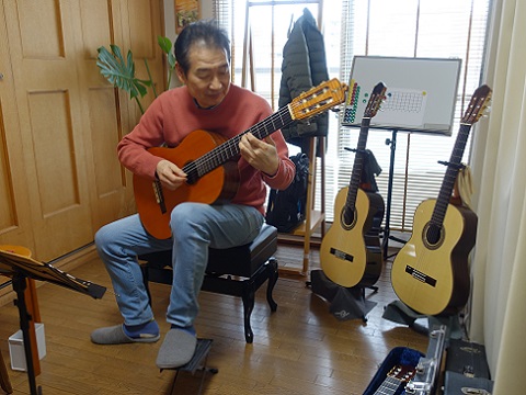 教室でもお馴染みの辻さんが、お手軽な値段で弾きやすいギターを探していて、ギター工房の福永さんに頼んで4本ギターを持ってきてもらいました。